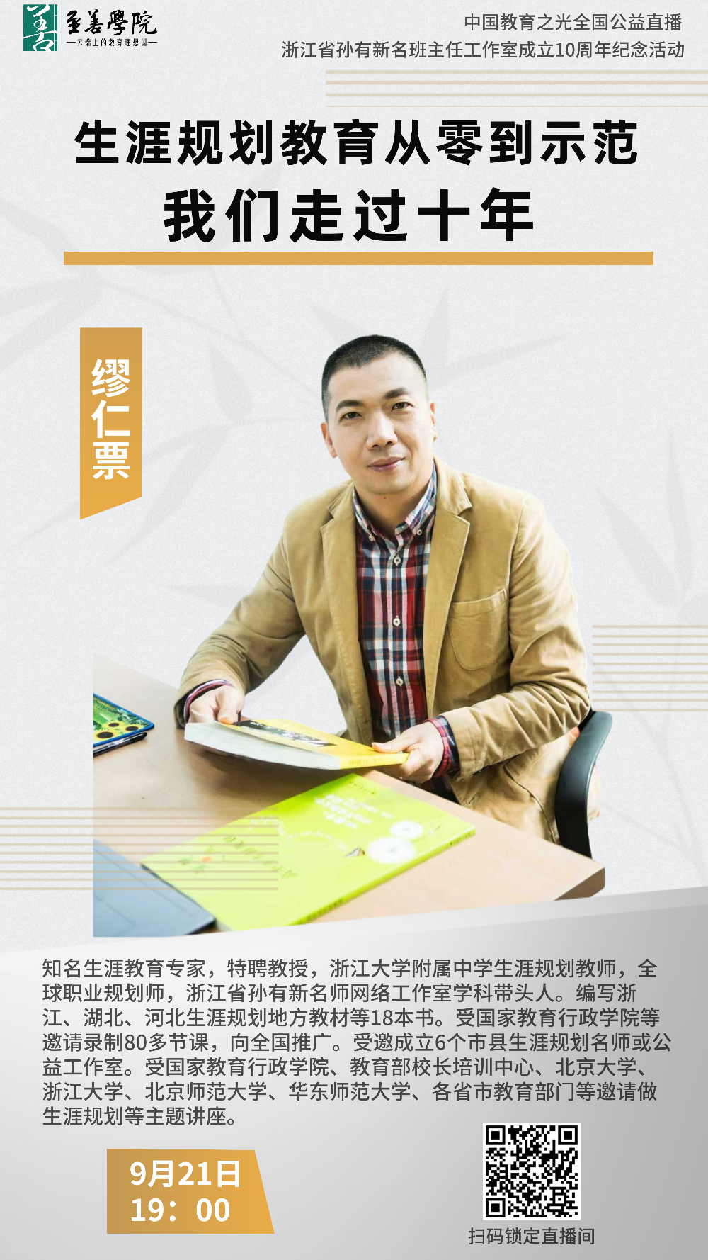 缪仁票,知名生涯教育专家,特聘教授,浙江大学附属中学生涯规划教师,全球职业规划师,浙江省孙有新名师网络工作室学科带头人。编写浙江、湖北、河北生涯规划地方教材等18本书。受国家教育行政学院等邀请录制80多节课,向全国推广。受邀成立6个市县生涯规划名师或公益工作室。受国家教育行政学院、教育部校长培训中心、北京大学、浙江大学、北京师范大学、华东师范大学、各省市教育部门等邀请做生涯规划等主题讲座。